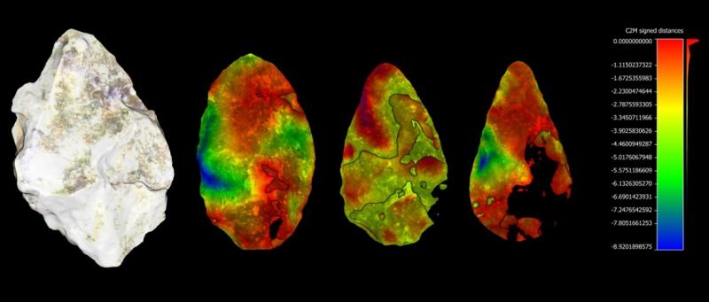 Modelo 3D de análisis topográfico que muestra la evolución en la elaboración de una herramienta. La comparación de estos modelos entre expertos, aprendices y novatos muestra diferencias significativas / Torres y Baena - UAM