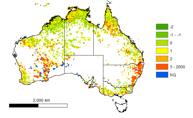 Más allá de la precisión de estas cifras, interesa considerar las anomalías que suponen sobre las tendencias observadas en la serie temporal disponible. Entre 2001 y 2018, se había quemado en ambos territorios un promedio de 7.574 km2, con un máximo en 18.100 km2 en 2003. Comparados con esos valores, en el 2019 se ha quemado en ambos estados 3.32 veces más del promedio anual y casi 5 veces más que en el 2018. La figura muestra la severa anomalía que suponen los incendios del 2019 en el SE australiano. Usando como base una cuadrícula de 0.25 grados (unos 25 km), en las zonas más pobladas de Nueva Gales, entre Camberra y Sidney y a lo largo de la costa, en algunas de ellas se ha superado el promedio de área quemada hasta 100 veces el valor de la desviación típica de la serie histórica (2001-2018), y son muy abundantes los valores z entre 3 y 6. Asumiendo una distribución gausiana de la ocurrencia histórica del fuego, la probabilidad de que se dén estos valores de área quemada está por debajo del 0.0001. En la figura también aparecen, en color azul, algunas zonas que no se habían quemado previamente en toda nuestra serie histórica. Hay que recordar que en Este y Noreste de Nueva Gales se encuentran algunas de las ciudades más pobladas del país, como Canberra, Wollong, Sidney, Central Coast y Newcastle. El sur de Victoria también ha sido muy afectado, incluyendo las inmediaciones de Melbourne. De ahí que las inusitadas quemas hayan ocupado la primera página de los medios internacionales, principalmente por el impacto del humo en la salud. En estas ciudades la población local ha tenido que permanecer refugiada en sus hogares huyendo de la severa contaminación aérea. Además de la influencia en la zona costera oriental, también aparecen valores anómalos en el estado de Australia occidental, en zonas muy poco pobladas. A estos valores hay que sumar las estimaciones que se han realizado desde el servicio atmosférico de Copernicus (https://atmosphere.copernicus.eu/wildfires-continue-rage-australia), que cifra en 400 millones de Tm el CO2 emitido a la atmósfera por estos fuegos.