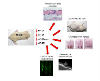 De forma notable, entre los miRNAs cuya expresión está disminuida en los ratones que carecen de TRs se encuentran algunos, como miR-21, miR-31, miR-34 y miR-203, que están entre los más expresados en la epidermis y que se sabe que desempeñan papeles predominantes en muchos de los procesos alterados en la piel de los ratones deficientes en TR. Por lo tanto, la regulación de la expresión de estos miRNAs podría ser responsable de parte de los defectos observados en estos animales, así como en los pacientes con trastornos tiroideos.