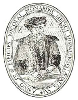 Nicolás Monardes. Grabado del libro: "Historia medieval de las cosas que traten de nuestras Indias Occidentales que sirven en medicina"