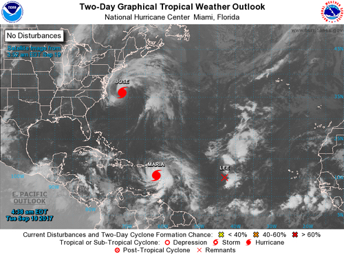 Figura 2: Situación actual con el Huracán "José", perdiendo fuerza al dirigirse hacia el norte y el nuevo huracán "María" acercándose a las costas de Estados Unidos y con categoría 5. (Fuente: National Hurricane Center)