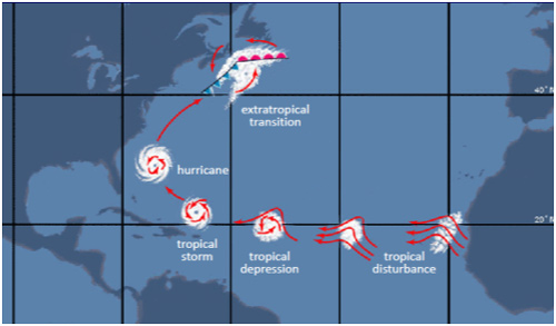 Figura 1: Evolución de los huracanes en el Atlántico Norte, desde su creación como perturbación tropical en Cabo Verde, transformación a depresión tropical, tormenta tropical, huracán y disipación hacia el norte (Fuente: National Hurricane Center)