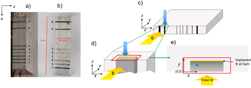 Imágenes del cristal de diamante irradiado con iones de boro (B) a 9 MeV, donde se aprecian las diferentes franjas de irradiación (rayas grises) producidas con diferentes fluencias: (a) justo después de la irradiación; (b) la misma muestra después de recocerla a 1200 °C. (c) Esquema del lateral irradiado del diamante y (d, e) ampliaciones indicando la zona barrida con el micro-Raman (rectángulo rojo) para una de las rayas de implantación. El haz de iones de B (flechas amarillas) avanza en paralelo al eje y, barriendo en la dirección z atravesando el espesor (0.5 mm) de la muestra de diamante. La dirección de la luz del láser se indica en azul, la region implantada de boro (alrededor de 5 μm de la superficie) es representada por una línea amarilla y la ruta del boro irradiado en gris.  / Alicia de Andrés y Miguel Ángel Ramos.