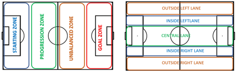 División del terreno de juego considerando dos divisiones del campo, una con respecto a la proximidad de la portería del oponente (gráfico izquierdo) y otra con respecto a los carriles laterales (gráfico derecho). El primero se divide en cuatro regiones, mientras que el segundo se divide en cinco regiones, cada una relacionada con una concepción táctica del juego. Fuente: Analysis of player speed and angle toward the ball in soccer.