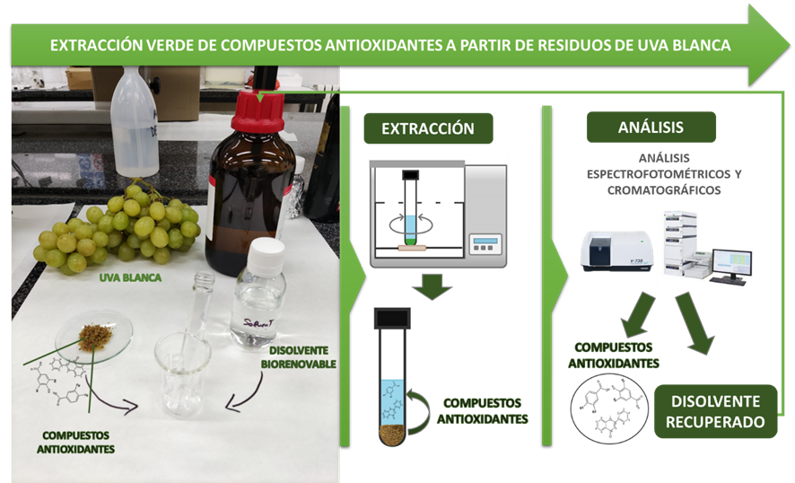 Esquema general del proceso de recuperación de compuestos antioxidantes del bagazo de uva blanca mediante el uso de disolventes renovables. Fuente: Raquel Cañadas. UPM.