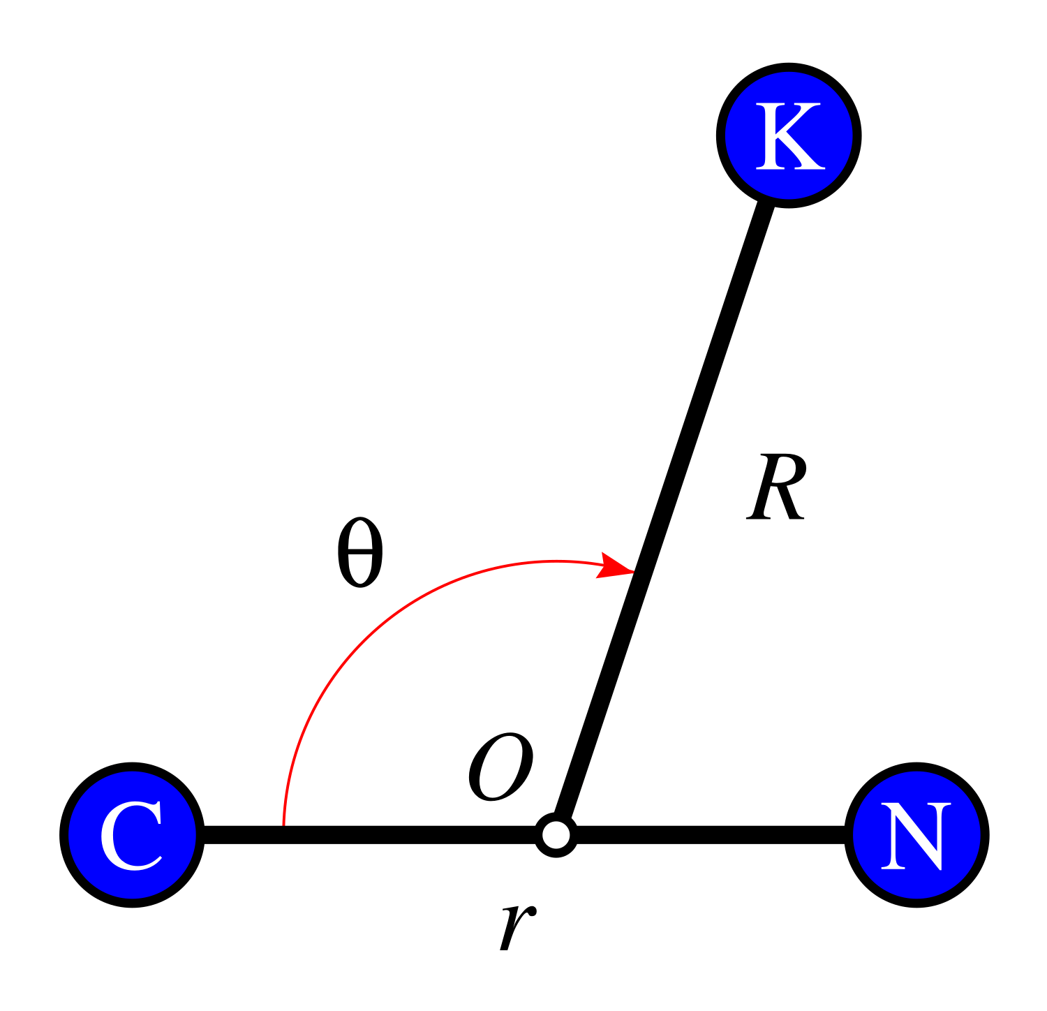 Sistema molecular KCN estudiado, formado por un átomo de potasio (K), un átomo de carbono (C) y un átomo de nitrógeno (N), y coordenadas (R, θ, r) que describen la configuración de la molécula. Fuente: UPM.