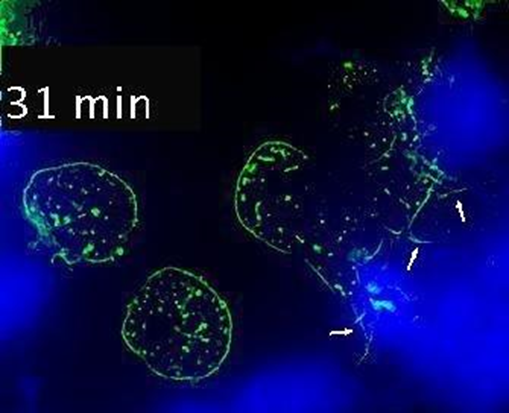 El citoesqueleto de actina, presente en el interior del linfocito T que forma una sinapsis inmune, crea una red o malla que se abre en la zona cercana a la sinapsis para facilitar la secreción de las vesículas extracelulares. Esta malla de actina filamentosa (F-actina) actúa como un embudo que guía las vesículas de secreción hacia la sinapsis inmune, permitiendo así la eliminación eficaz de la célula diana, ya sea infectada por un patógeno o de naturaleza tumoral.