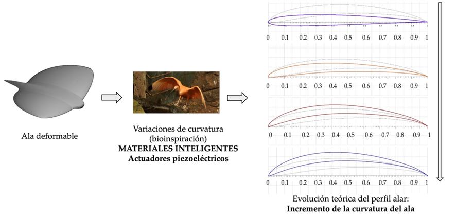 Fruto de la colaboración entre la Escuela Técnica Superior de Ingeniería Aeronáutica y del Espacio (ETSIAE), de la Universidad Politécnica de Madrid (UPM), y el Instituto Nacional de Técnica Aeroespacial del Ministerio de Defensa (INTA), el trabajo desarrollado ha dado como resultado un “micro dron bioinspirado” con geometría alar deformable en el que se han sustituido los elementos mecánicos móviles por superficies aerodinámicas deformables por medio de materiales inteligentes en un ala, lo que conlleva un impacto en la mejora de las actuaciones del aparato.