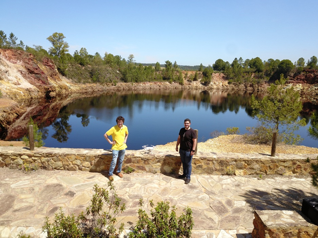 Los investigadores Carlos Boente (UPM) y Adrián Zafra (UHU), preparados para la realización de un muestreo aéreo en una explotación minera abandonada. Fuente: UPM