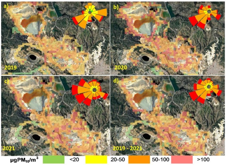 Distribución media del PM atmosférico en la superficie de la mina en diferentes años. Fuente: A novel application of mobile low-cost sensors for atmospheric particulate matter monitoring in open-pit mines