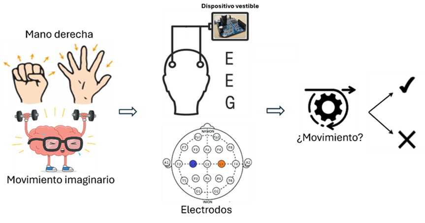 El movimiento imaginario es capturado por electrodos que llevan la información al dispositivo vestible para decidir si es movimiento o no. Fuente: Ana Carretero Pérez.