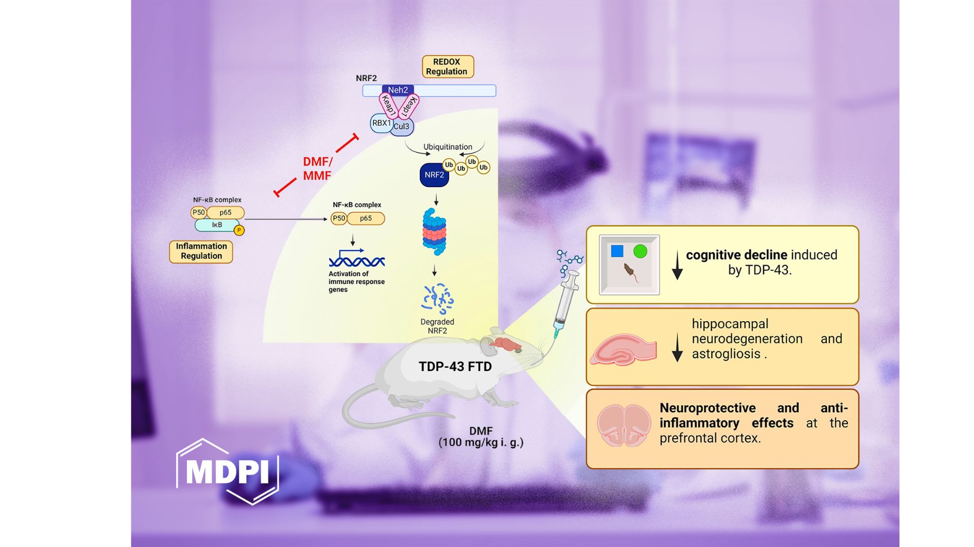 El equipo, liderado por la Dra. Isabel Lastres Becker en la Universidad Autónoma de Madrid (UAM), en colaboración con investigadores de la Universidad Complutense de Madrid (UCM) liderados por los Dr. Javier Fernández-Ruiz y Eva de Lago, evaluó el proceso neurodegenerativo, los marcadores inflamatorios, el estrés oxidativo y la acumulación de TDP-43. Los resultados, publicados en la revista Antioxidants, revelan un efecto protector del DMF, mitigando el daño cerebral.