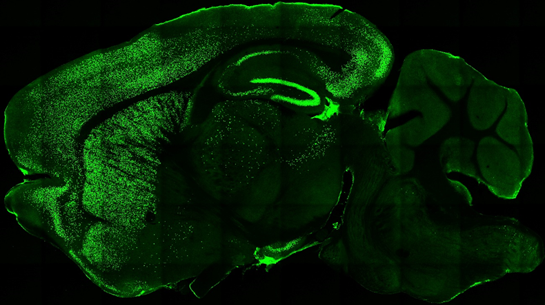 Expresión de uno de los factores de Yamanaka, Klf4, en un corte transversal del cerebro de uno de los ratones transgénicos con expresión condicional del transgén que contiene los factores.