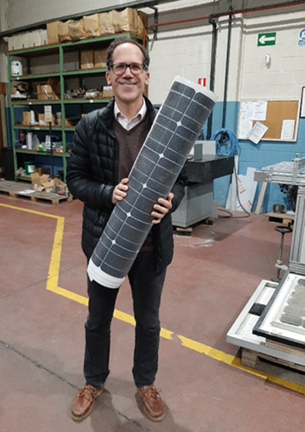 El investigador principal sosteniendo una sábana enrollada de células solares encapsuladas tras separarlas del vidrio frontal. Autor: David Fuertes Marrón.