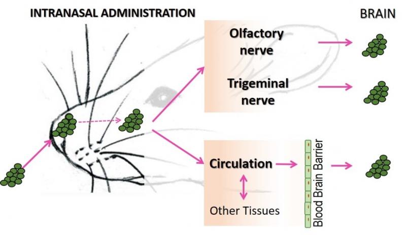La administración de hormonas tiroideas a través de la cavidad nasal permite su entrada directa al cerebro, a través de la vía del nervio trigémino o del nervio olfativo, sin necesidad de atravesar la barrera hematoenfálica. A su vez, parte de las hormonas administradas pueden ir a la circulación sanguínea desde donde son transportadas al resto de tejidos, o al cerebro tras pasar la barrera hematoencefálica.  / CIBERER