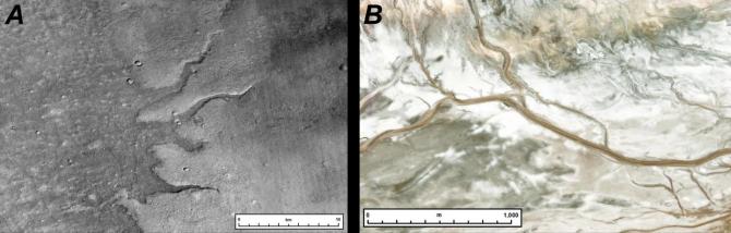 A) Un conjunto de crestas en Marte (en las coordenadas -67,64°E, 43,37°S). Para determinar si los rasgos son crestas o valles, los investigadores se basan en la iluminación de los cráteres de impacto (depresiones). Basándose en los cráteres, la luz proviene de la parte superior de la imagen. Debido a que las crestas fluviales están proyectando sombras hacia el sur, pueden inferir que el rasgo está sobresaliendo de la superficie, y que es una cresta en lugar de un valle. (B) Un entorno similar, "análogo" en la Tierra. Crestas fluviales similares a las de Marte podemos verlas en el sistema fluvial de la Amargosa de California; aunque con agua todavía corriendo por el sistema, es el precursor activo de las crestas que quedan en Marte. (Foto: J. Dickson)