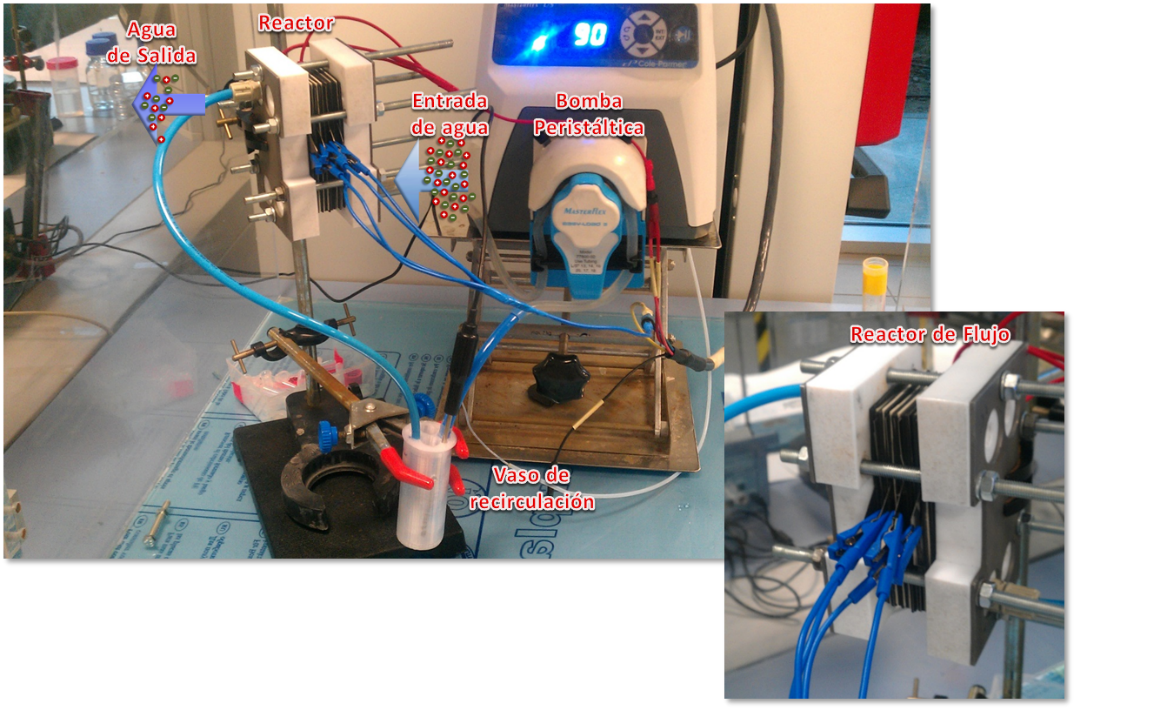 Figura 3. Dispositivo experimental empleado en la prueba de concepto. Detalle de la celda de flujo de desionización capacitiva.