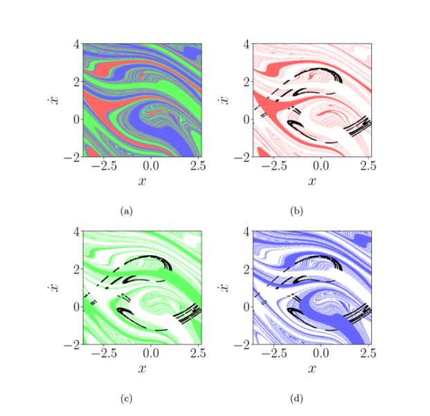 La idea del proceso se ilustra en la figura. El panel (a) muestra las tres cuencas de atracción de este sistema con la propiedad de Wada, lo cual indica que hay tres atractores cuyas cuencas comparten una misma frontera. Las figuras (b), (c) y (d) muestran cada una de las cuencas con su respectivo color, y las otras dos están fusionadas y aparecen en color blanco. Los puntos negros son puntos de la silla caótica. Una simple inspección visual sugiere que las sillas caóticas calculadas de este modo son las mismas, lo que inmediatamente nos llevaría a concluir que el sistema tiene la propiedad de Wada. “Sin embargo, comparar conjuntos fractales no es algo sencillo”, explica Álvar Daza, coautor del estudio. “Para comparar entre sí las sillas correspondientes a las diferentes cuencas es necesario realizar un cálculo de las distancias de Hausdorff entre los diferentes conjuntos de puntos”. Para un elevando número de puntos, el cálculo de esta distancia es pequeño y similar entre los diferentes conjuntos, lo que confirma que los puntos pertenecen en realidad a la misma silla caótica y, por lo tanto, el sistema posee la propiedad de Wada.