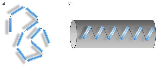 Figura 1. a) Polímero libre en su forma desordenada. b) Polímero organizado dentro de un material poroso.