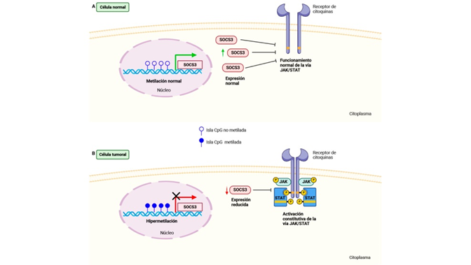 Consecuencias derivadas de la hipermetilación de SOCS3 en T-ALL/LBL. (A) Metilación y expresión de SOCS3 en células normales. (B) La hipermetilación de SOCS3 en las células tumorales contribuye a una expresión reducida de SOCS3 y a una activación constitutiva de la vía JAK/STAT / Lahera et al. - BioRender.com.