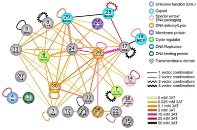 Mapa de interacciones detectadas entre todas las proteínas de Bam35. Se muestra tipo de proteína y concentración del inhibidor (3AT) a la que la interacción es detectada, lo que indica la estabilidad de la interacción. /UAM-CSIC