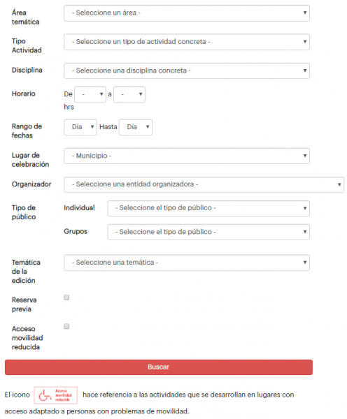 La web ofrece la información de una forma práctica, a través de un buscador en el que se pueden introducir distintos criterios para encontrar la actividad deseada de una forma rápida y sencilla. De este modo, es posible filtrar los resultados por área temática, tipo de actividad, disciplina, fecha, horario, lugar de celebración, institución organizadora, tipo de público, si es necesario hacer reserva previa o si es accesible para personas con movilidad reducida.