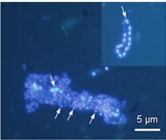 Figura 1. Esporas (flechas), células agrupadas en cadenas o masas más numerosas de células conforman comunidades microbianas en la naturaleza y de las que solo un 1% pueden ser cultivadas en el laboratorio. Créditos: CAB-INTA-CSIC.