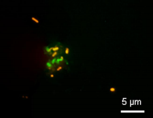 Figura 2. Grupo formado por bacterias (naranja) y arqueas (verde) viables a 70 cm de profundidad en el permafrost Antártico. La estrecha dependencia nutricional entre diferentes microorganismos es una de las razones por las que su cultivo en el laboratorio es difícil de conseguir. Créditos: CAB-INTA-CSIC.