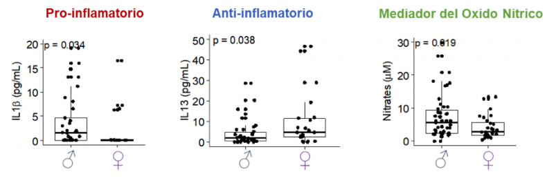 Diferencias en los niveles plasmáticos de citoquinas pro-inflamatorias (IL-1b), anti-inflamatorias (IL-13) y niveles de óxido nítrico (Nitratos) en mujeres embarazadas con un feto masculino (♂) o femenino (♀).  / Modificado del articulo original.