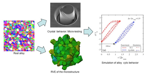 El planteamiento llevado a cabo por el Instituto IMDEA Materiales en el proyecto (Figura 2) está basado en la homogeneización computacional de policristales, una técnica que relaciona la microestructura y el comportamiento cristalino del material con su respuesta mecánica mediante ensayos virtuales. En pocas palabras, se puede decir que esta técnica necesita una serie de datos de la microestructura real del material (real alloy en Figura 2) y unos sencillos y económicos ensayos mecánicos a esta escala microscópica (micro-testing en Figura 2) y con ellos es capaz de reproducir las curvas que describen el comportamiento mecánico del material (simulation of alloy ciclic behavior en la Figura 2).