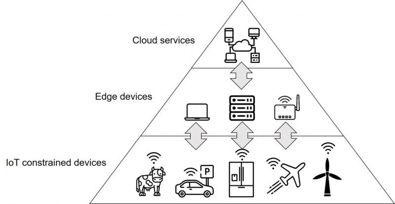 Esta imagen ilustra la arquitectura de tres capas que se ha tenido en cuenta en el trabajo, incluyendo los nodos Edge entre los dispositivos con recursos limitados y los servicios en la nube. Estos nodos Edge son los que consiguen los tokens de acceso (los negocian, los validan, etc.) que luego pueden delegar a alguno de los dispositivos IoT con recursos muy limitados.