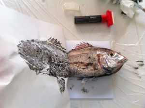"Gyotaku" (魚 拓) es un sistema de estampación natural utilizado por los pescadores japoneses del siglo XIX para registrar sus mejores capturas. Se aplican pigmentos sobre el pescado, que luego se presiona sobre papel de arroz u otra superficie, logrando una imagen única que recoge el alma del pez.