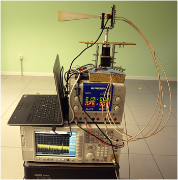 Configuración de medición utilizada para caracterizar la propagación de señales en frecuencias de ondas milimétricas.