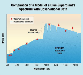 Comparación de un modelo del espectro de un supergigante azul con datos de observación. / Hubblesite.org