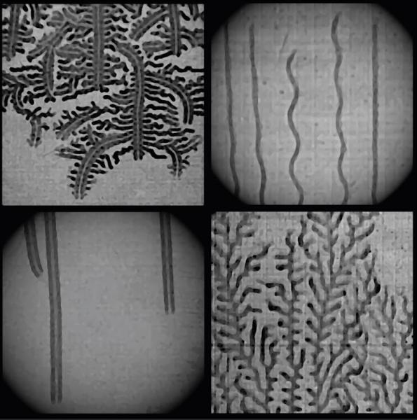 Pie de imagen: Propagación de una llama de hidrógeno “ultra-pobre” en una cámara de combustión muy estrecha. Las imágenes de la izquierda muestran una llama que se propaga verticalmente hacia abajo; las de la derecha se propagan en sentido inverso. Las marcas oscuras muestran la trayectoria seguida por la llama, mientras que las partes claras indican el hidrógeno que no se ha quemado. Crédito: Veiga-López, Physical Review Letters (2020).