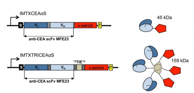 En la investigación, los expertos han desarrollado dos inmunotoxinas –la trimérica arriba descrita y otra con un diseño monomérico clásico - ambas basadas en la ribotoxina α-sarcina.