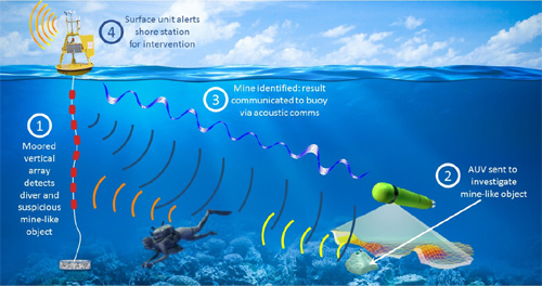 "Teniendo en cuenta los desafíos y oportunidades que se presentan, creemos que una solución adecuada es aplicar la detección acústica para la identificación de un buceador y una combinación de detección acústica y basada en imágenes para revelar una mina sumergida", explican los co-directores del proyecto Roee Diamant (Universidad de Haifa) y Lutz Lampe (Universidad de Columbia Británica). "En este último caso, el procesamiento de la señal acústica proporciona detección y localización de los objetivos, y los datos de imágenes se obtienen enviando un AUV a una distancia segura de la mina sospechosa, para inspeccionar el objeto usando cámaras ópticas o imagen de sonar. Esto sirve para verificar lo que se ha detectado. La comunicación con el AUV se basa en señales acústicas bajo el agua. De esta manera, el sistema puede enviar al AUV las coordenadas aproximadas del objetivo, y puede recibir de vuelta la imagen de destino ya procesada. "