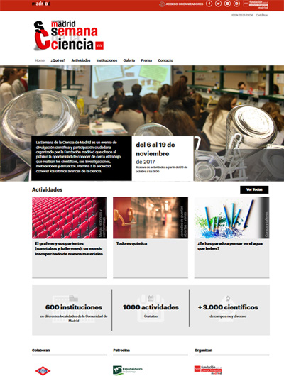La Fundación para el Conocimiento madri+d coordina, por decimoséptimo año consecutivo, la Semana de la Ciencia de Madrid, una apuesta de la Consejería de Educación e Investigación de la Comunidad de Madrid que ofrece -del 6 al 19 de noviembre- más de 1.000 actividades lúdicas y gratuitas para todos los públicos: niños, adolescentes, estudiantes universitarios, profesores, familias y todos aquellos con espíritu curioso que esperan esta cita para descubrir el trabajo de los investigadores de Madrid, así como muchos lugares emblemáticos habitualmente cerrados al público y que forman parte del patrimonio arquitectónico de la Comunidad.
